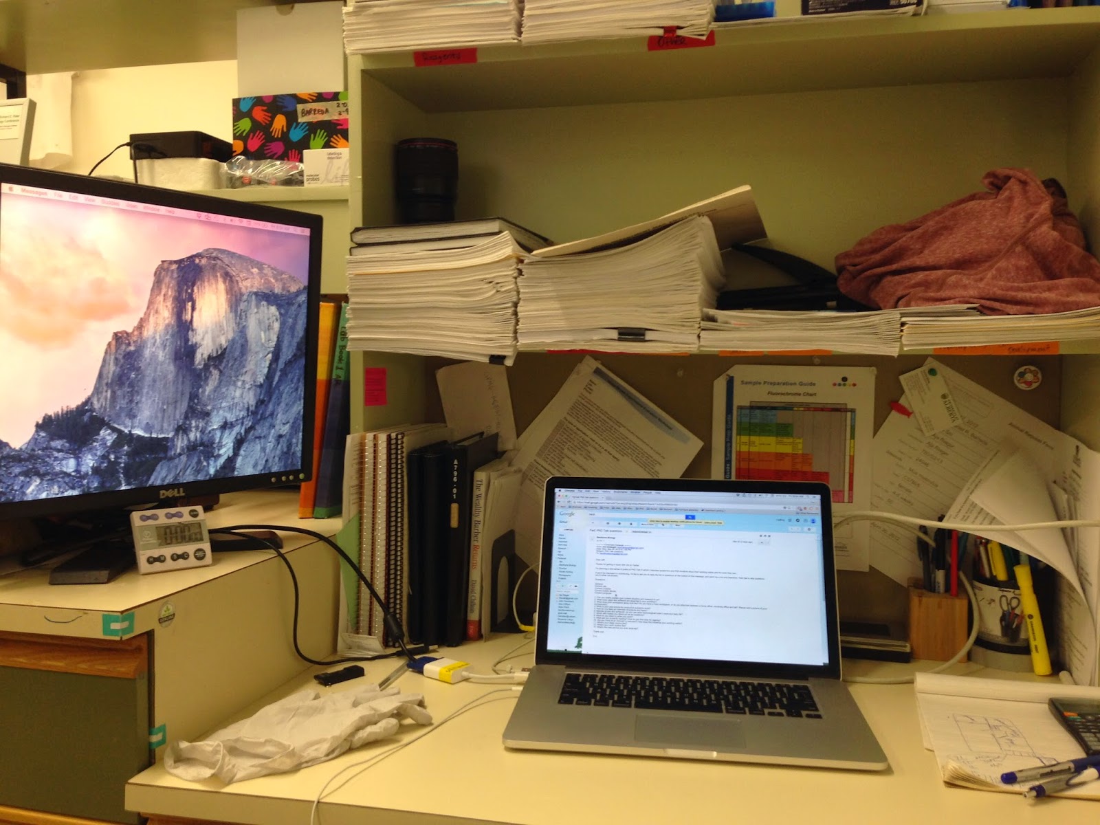 My workspace is relatively low tech- I typically bring only my iPad or Macbook to my lab at the University. I also generally use a second monitor at work. Stacks of paper surround me, albeit they are all organized!