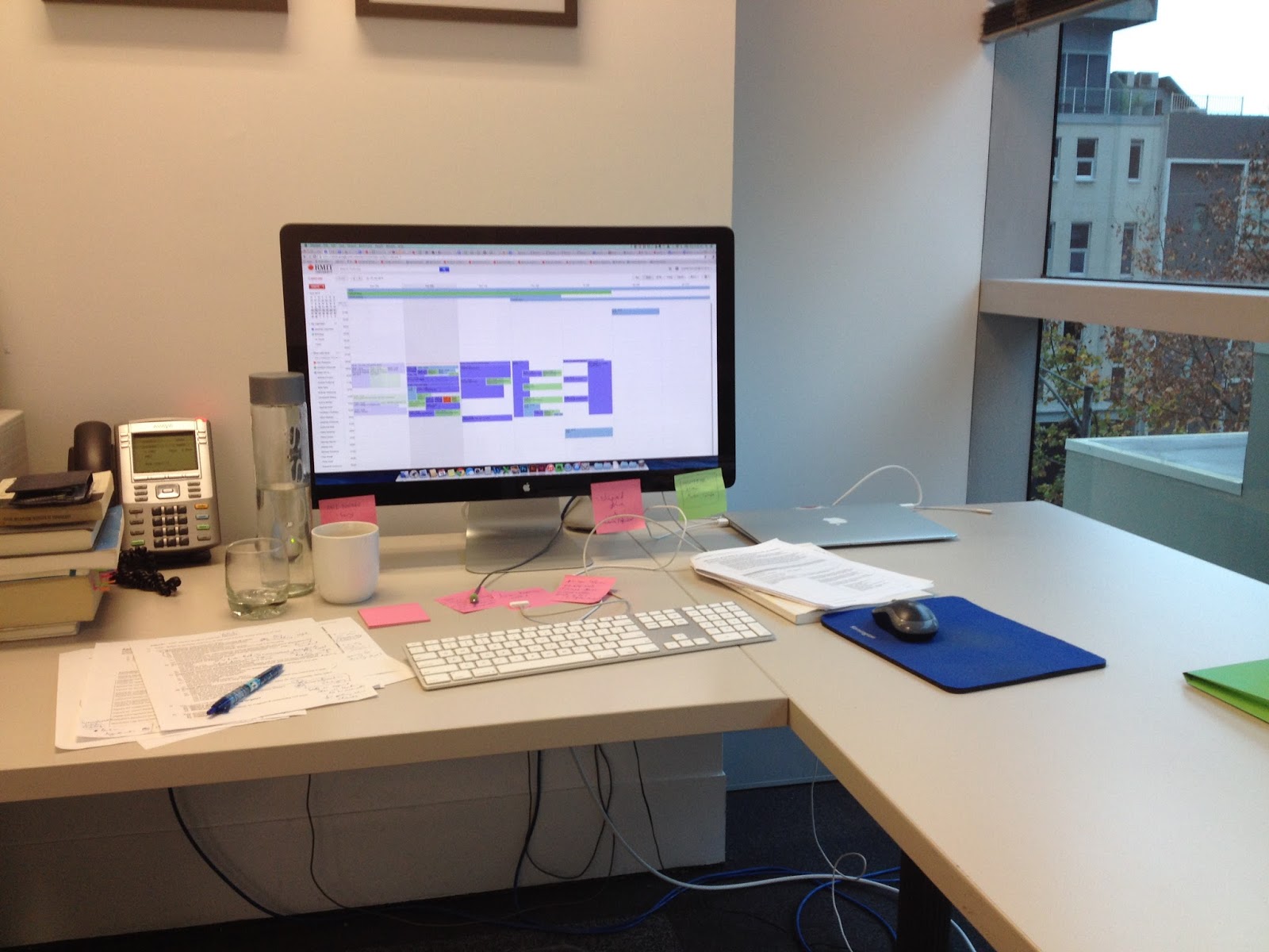 My workplace is a desk in a shared (2-person) office though I often have meetings elsewhere on campus. I use the local cafe a lot for meetings as it's central and has wifi etc.