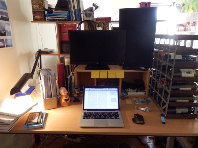 I worked in a PhD pool office of some 30 students, at Civil Engineering Faculty. This is either a very quiet or a very noisy place, rarely somewhere in between. A pair of noise cancellation headphones was useful for those days. Since the thesis writing phase started 4 months ago, I began working from my living room. It has a desk with two external monitors, external keyboard and a huge must is a mouse (MX Master from Logitech, highly recommended if you have big hand and long fingers).