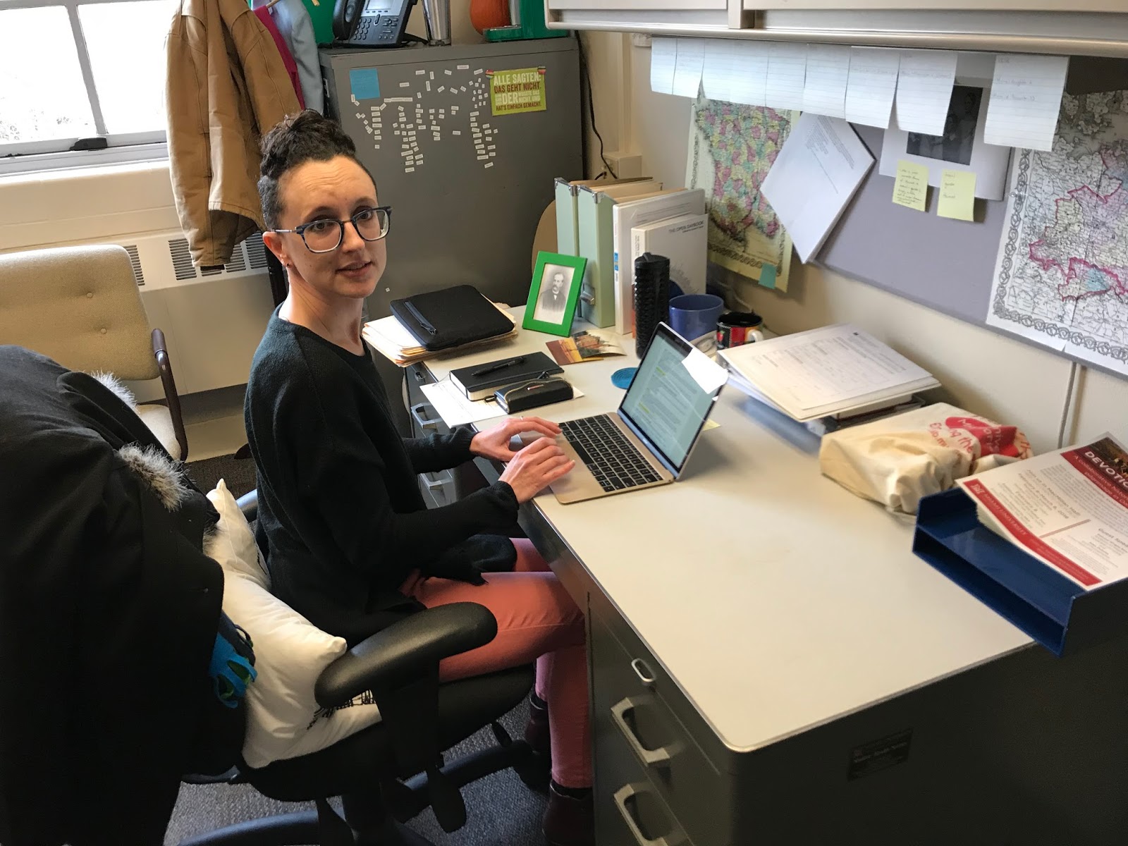 I live outside of the city of Winnipeg which means about a thirty minute to one hour commute to get to work or to get to school. Sometimes I work at home -- whenever I can but that is not often these days. I teach 2 days a week currently and those days are spent at my Red River office. I usually have to be at the university for some student related activity for minimum one other day of the week. I will set up office in the grad lounge on those days or the research office depending on what needs to be done. My kids don't go to school in the town I live in, so they get driven into the city with me which often means I do a split work day. My office hour time is done by about 3PM and then I drive to pick up the kids and do grocery shopping and run errands and take them home. The kids are 16 and 14 now. Then I work for another hour till dinner, and, many evenings, after dinner for another couple hours.